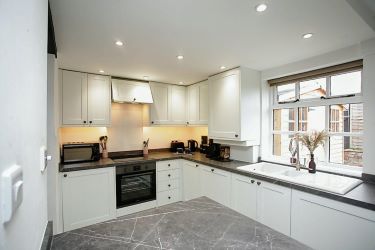 You enter a fully modernised bright kitchen with spot-lights, white shaker units with a grey marble effect worktop and all the integrated appliances required for modern living including oven, hob, extractor, fridge, freezer and washing machine/drier. The design of the recently fitted kitchen makes excellent use of space which includes a breakfast bar and ample storage for all your kitchen accessories.