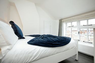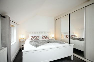 At the end of the landing is the large master bedroom overlooking the rear garden and currently containing a super king luxurious white bed with plenty of extra room to spare. The bedroom benefits from floor to ceiling fitted wardrobes with Hammonds sliding mirrored doors across the whole side of the bedroom. This provides ample space for all your clothes and shoes and other accessories. The bedroom also benefits from a Cable TV connection point.
