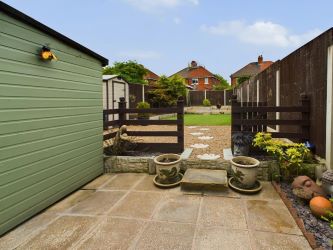 Leading out from the kitchen gives access to the large rear garden with a patio, pebbled area, artificial grassed area and high fencing creating privacy.