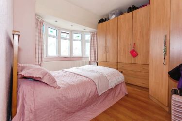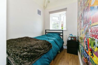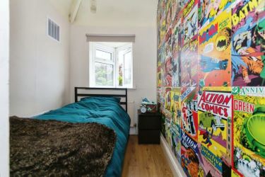Upstairs, there are three bedrooms—two doubles and a good-sized single. The family bathroom is also on this floor and includes a white suite with a bath and shower overhead.