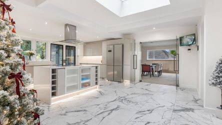 Steps rise to the main entrance, opening into the centrepiece of the home: an exceptional Kitchen/Breakfast Room, comprehensively refitted in 2021 to an outstanding standard. Designed for both everyday living and entertaining, the space features a sleek central island ideal for preparation or informal dining, alongside premium integrated appliances including a double oven, induction hob, fridge-freezer and dishwasher. A large skylight bathes the room in natural light, enhancing the sense of space and airiness.