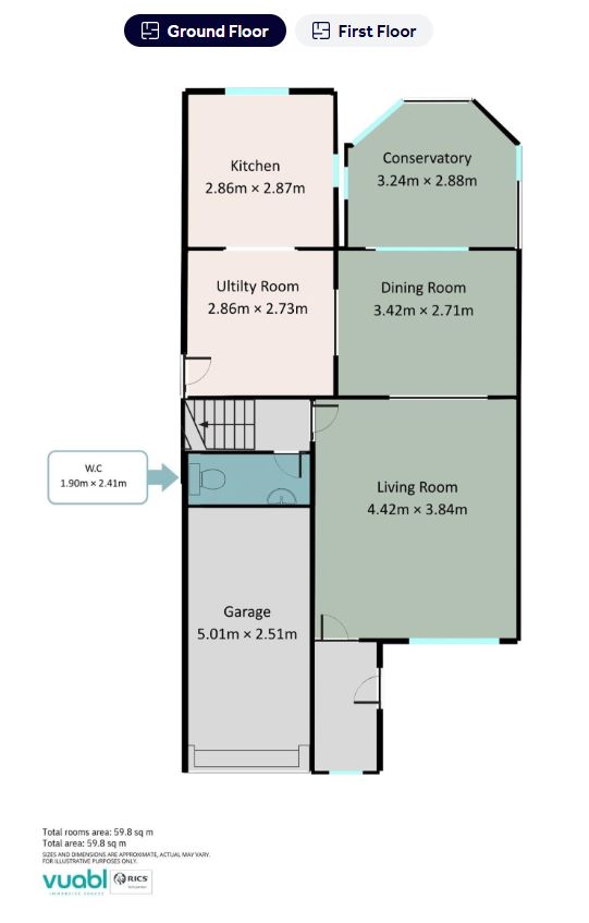 To the rear, the separate dining room provides an ideal setting for family meals and entertaining, with direct access into the conservatory. The conservatory enjoys a pleasant outlook over the garden and offers a bright and versatile additional reception area, ideal for relaxing or informal seating. Positioned to the side of the dining room is a generous kitchen, providing extensive storage and worktop space and serving as a functional and well-laid-out family kitchen. A convenient downstairs WC completes the ground floor accommodation.