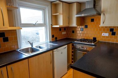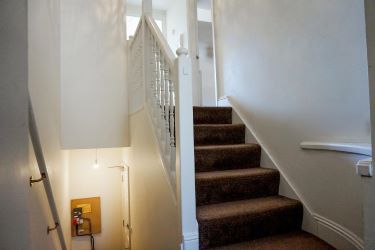 Communal entrance from the street into communal hall and stairs to first floor and front door. Stairs inside the flat lead to a modern bathroom with basin atop vanity unit, bath with shower over, and toilet. Adjacent is a useful utility area with plumbing for washing machine. Further stairs lead to landing with doors to living room and bedroom. Double bedroom to the front of the property with dual frontage double glazed windows. Open plan living space and kitchen to the rear with rear aspect double glazed window. Modern fitted kitchen including variety of wall and base storage units, laminate worktops, breakfast bar, in-built electric oven with gas hob and extractor. Space for under-counter fridge and freezer.