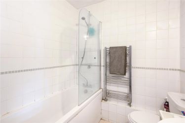 The bathroom suite includes a bathtub with a shower above and a glass shower screen.