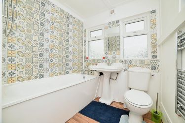 The downstairs bathroom has a bath, basin and w/c, wall tiles, towel rails but could do With some updating/fixing TLC.